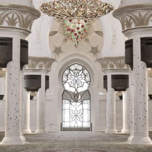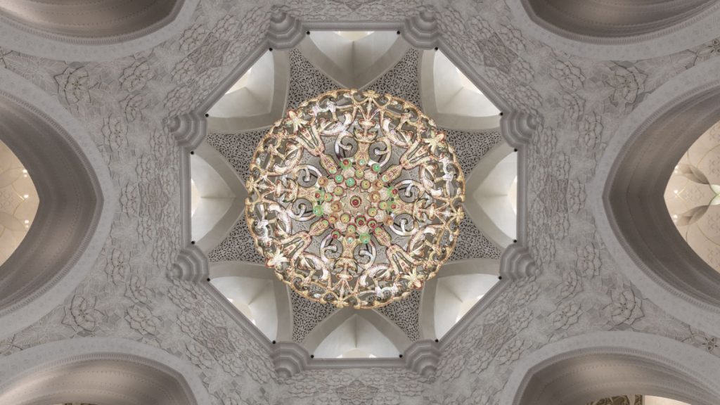 Suspended from the domes are seven magnificent chandeliers, designed by the German firm Faustig. Each chandelier is crafted from stainless steel plated with 24-carat gold and adorned with Swarovski crystals, with nearly 40 million crystal units used across all seven. The largest chandelier hangs in the main prayer hall, weighing 12 tonnes and measuring 10 metres in diameter. Their design resembles an upturned palm tree, symbolising the UAE’s heritage, sustenance, and prosperity.