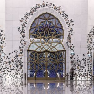 The Qibla wall, the wall facing the direction of Makkah, is one of the mosque’s most spiritually significant features. It is adorned with all 99 Names of Allah, inscribed in traditional Kufic calligraphy by the prominent UAE calligrapher Mohammed Mandi Al Tamimi. Each name is set within an elegant pentagonal floral pattern, with the word “Allah” at the centre. The calligraphy is subtly back-illuminated with fibre-optic lighting, giving the sacred names a gentle, glowing presence. The mihrab (prayer niche) is inlaid with stripes of 24-carat gold.