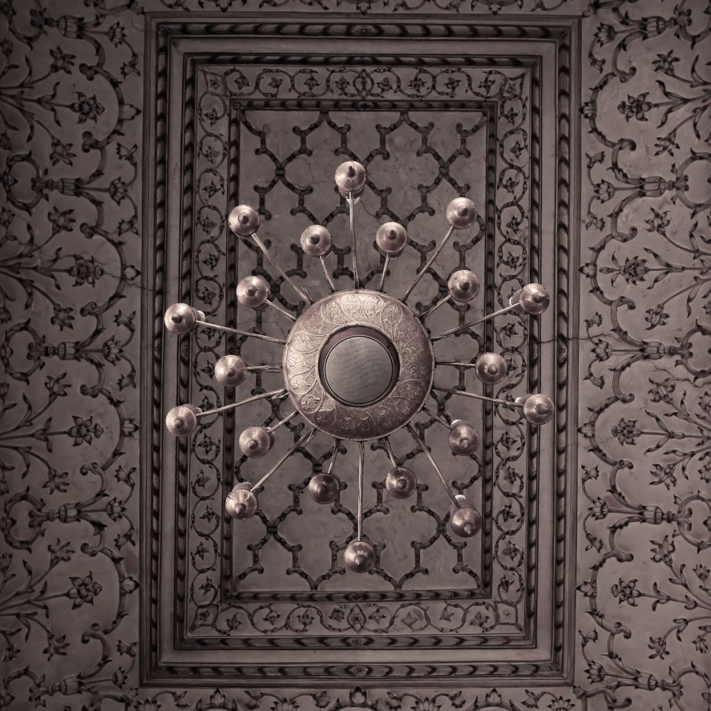 The interior of the prayer hall is a masterpiece of Mughal decorative art. The walls and ceilings are adorned with intricate floral motifs carved in stucco relief, fresco paintings, and white marble inlay work. Verses from the Quran are inscribed across the walls, while delicate Zanjira interlacing patterns (interlocking geometric designs) and floral tendrils in bold relief are considered unsurpassed works of Mughal craftsmanship. The prayer hall is divided into seven compartments separated by richly carved arches supported by heavy columns, with chambers on either side that were originally used for religious instruction.