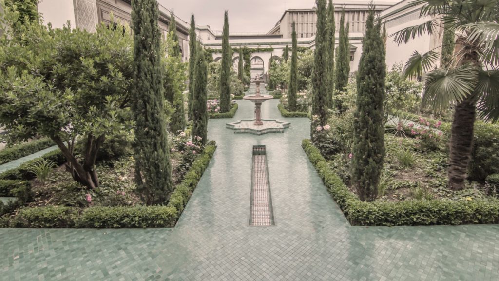 At the heart of the complex lies a serene Andalusian garden, inspired by the courtyards of the Alhambra. Enclosed by sculpted arcades and horseshoe arches, the garden is filled with palm trees, exotic flowers, and climbing wisteria that drape over the arches each spring. Water fountains, waterfalls, and marble pools add to the atmosphere of tranquillity. It is one of the most peaceful corners of Paris, a hidden oasis where the noise of the city simply melts away.