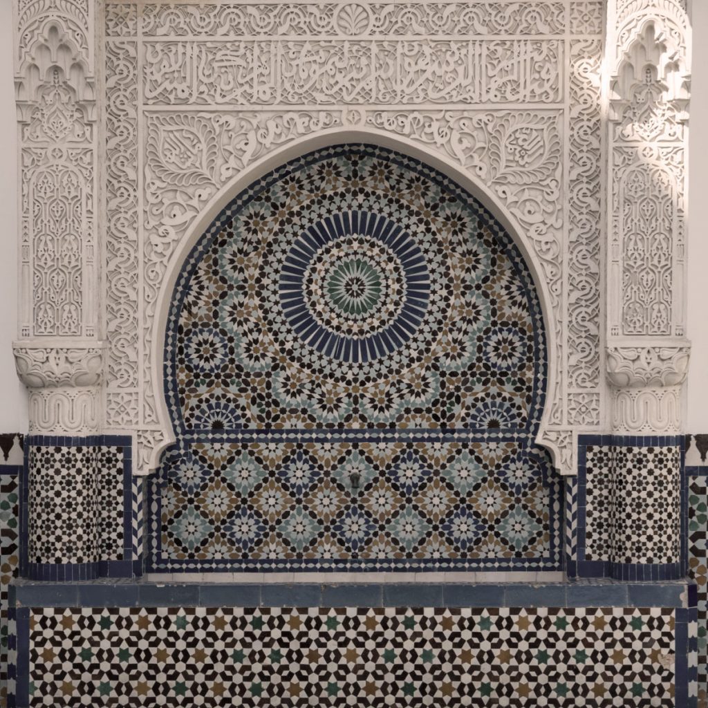 The decorative programme of the mosque was created by North African artisans using traditional techniques that have been passed down for centuries. The walls and corridors shimmer with zellige mosaics in vibrant blues, greens, and whites, while hand-carved stucco and wrought iron from Morocco adorn the arches and doorways. The prayer hall features a magnificent hand-sculpted cedar dome, a giant chandelier, and precious carpets donated by King Fouad of Egypt and the Bey of Tunis. The entrance to the Grand Patio is a jewel of Moroccan art, with its door decorated with Kufic calligraphy reproducing verses from the Quran.